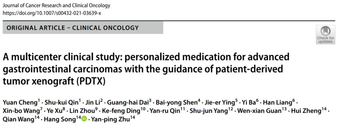 PDTX指導晚期消化系統腫瘤治療研究相關成果成功發表在臨床腫瘤學SCI期刊《Journal of Cancer Research and Clinical Oncology》