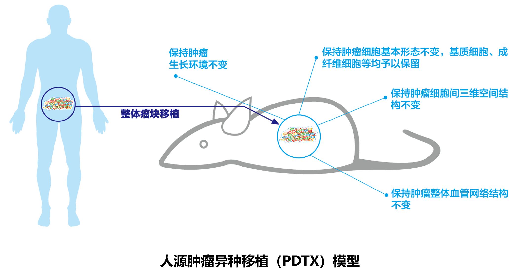 腫瘤活組織制備技術(shù):人源性腫瘤組織異種移植(PDTX)技術(shù),即將原代腫瘤組織移植入免疫缺陷小鼠體內(nèi)進行擴增傳代,通過PDTX技術(shù)制備獲得的腫瘤活組織包含腫瘤細(xì)胞、基質(zhì)、成纖維細(xì)胞和微血管,完整保留了原始腫瘤的三維結(jié)構(gòu)、異質(zhì)性及腫瘤微環(huán)境,PDTX模型是目前最理想的模擬人源腫瘤的藥效檢測模型。