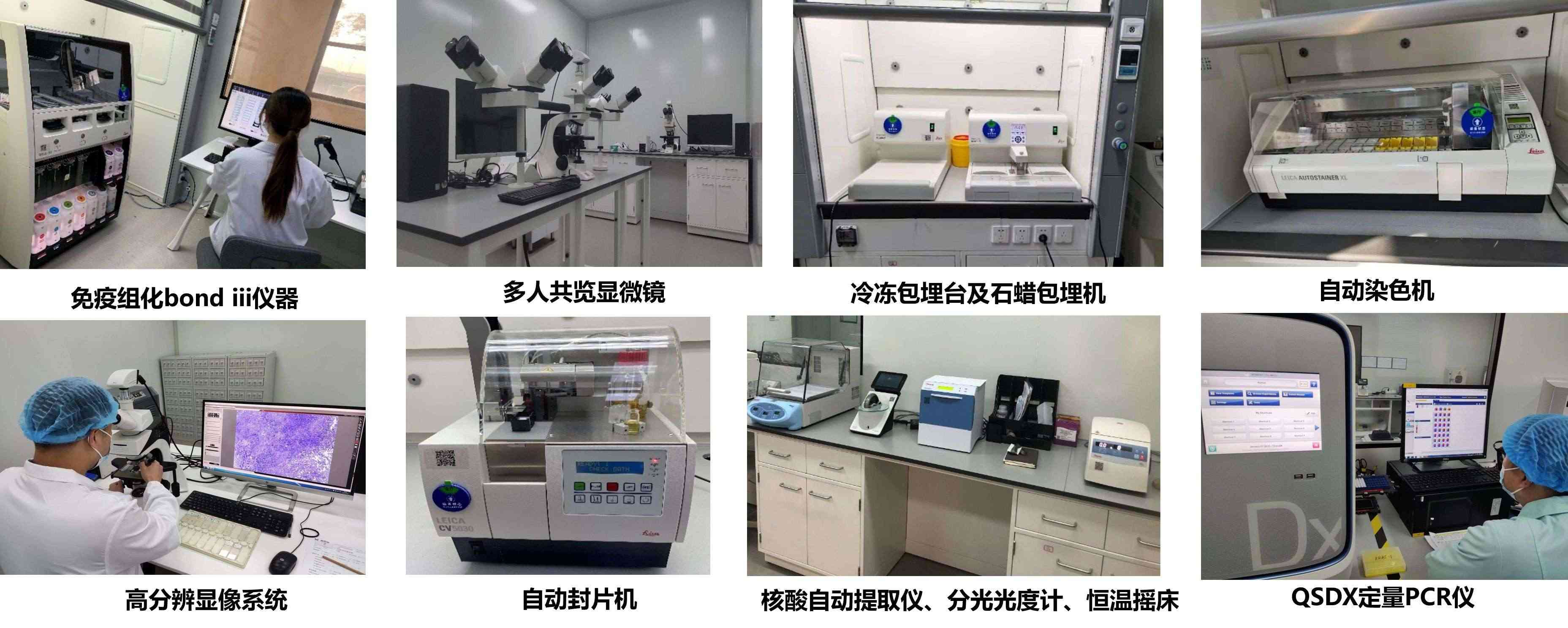 擁有德國徠卡(LEICA)全自動病理檢測系統(tǒng)、全自動免疫組化及原位雜交染色系統(tǒng),賽默飛(Thermo Fisher)實時熒光定量PCR儀、RNA / DNA自動提取設備、組織破碎儀、恒溫搖床、生物安全柜等。